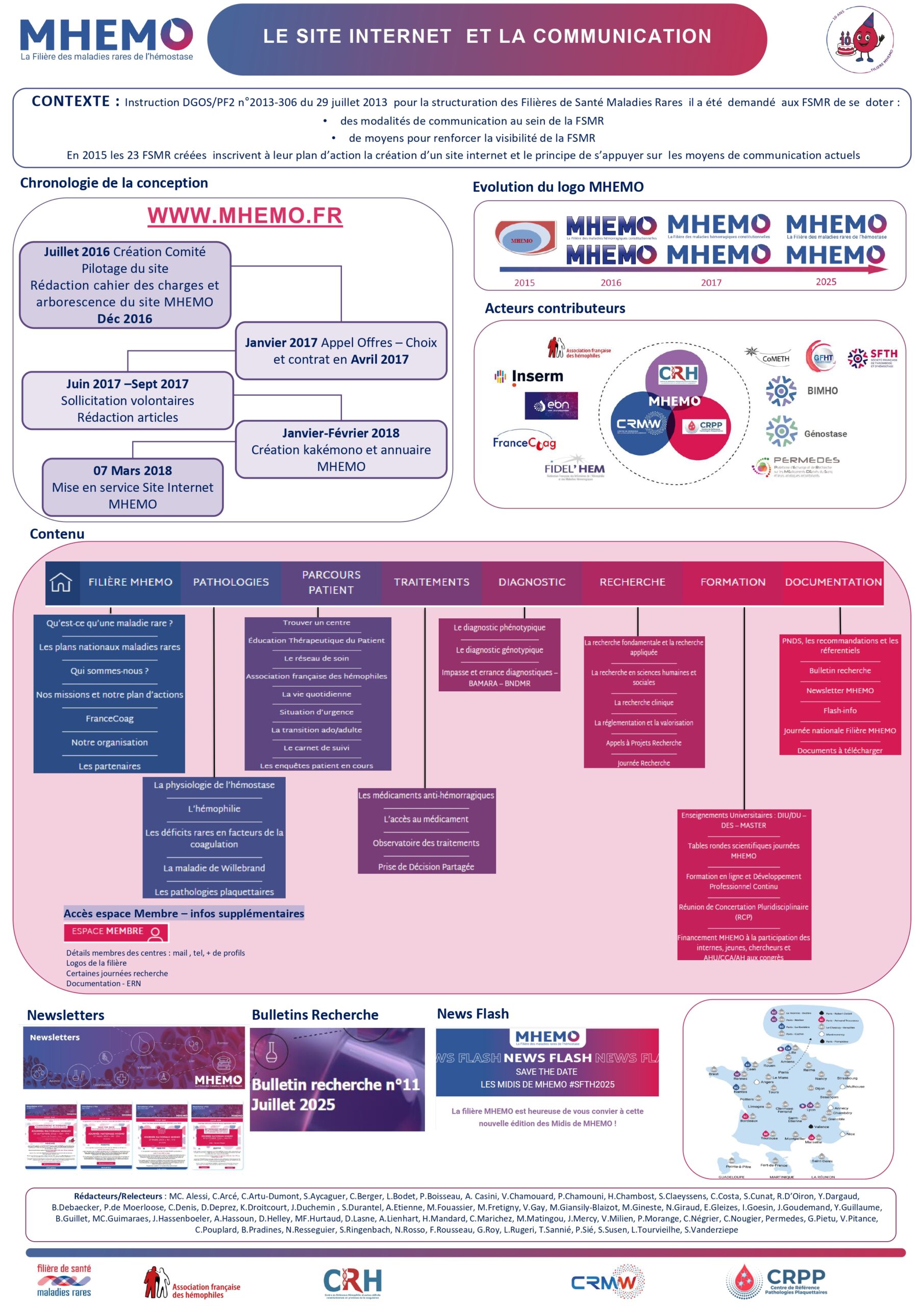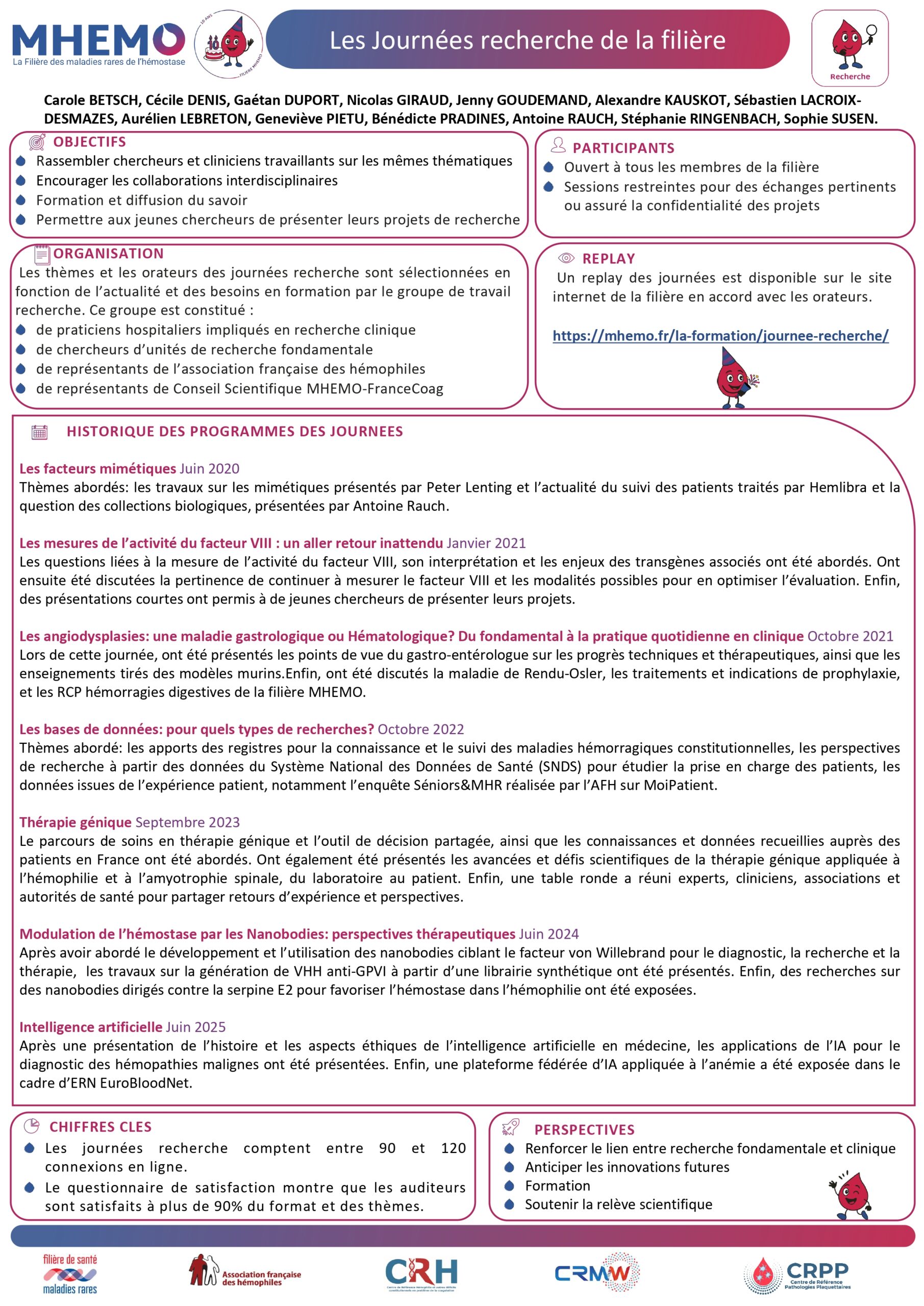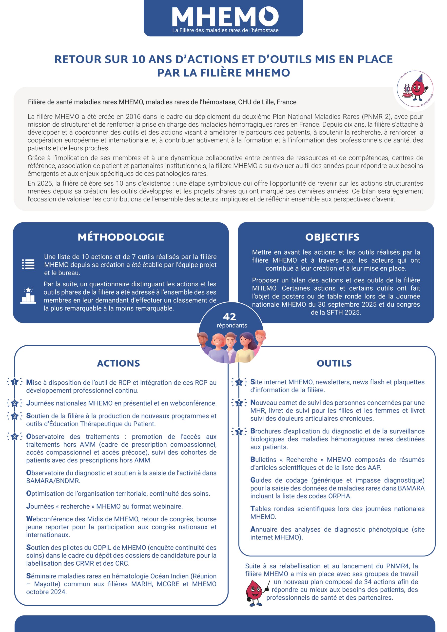 Créée en 2015, la filière MHEMO a pour mission de structurer, coordonner et renforcer la prise en charge des personnes atteintes de maladies rares de l’hémostase sur l’ensemble du territoire. En dix ans, elle est devenue un acteur central, fédérant centres de référence, centres de ressources et de compétences, association de patient, partenaires institutionnels, professionnels de santé et chercheurs .
