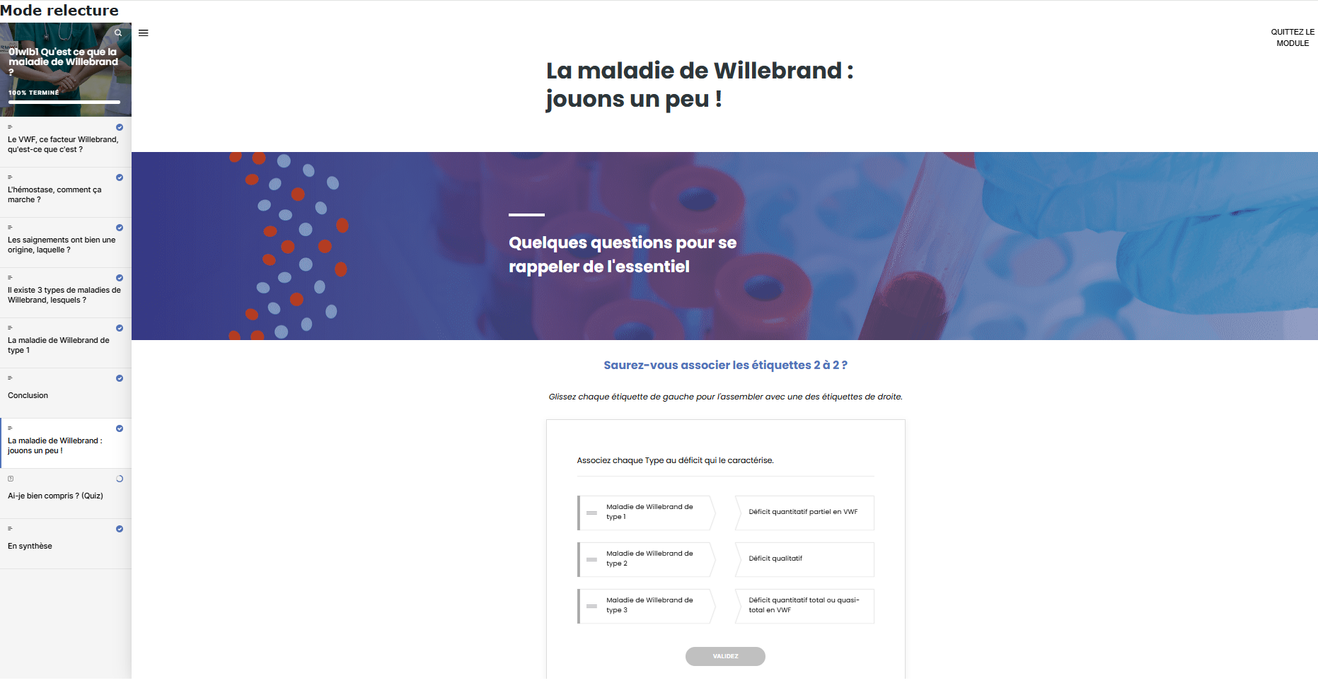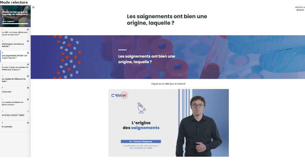 Déployé en 2023, WILLEARNING est un programme d’éducation thérapeutique du patient (ETP) dématérialisé entièrement dédié à la maladie de Willebrand. Conçu par les membres du CRMW, avec validation médicale et relecture associative par des patients ressources, il est accessible à l’ensemble des centres qui en font la demande. Après une phase d’ajustements en 2024-2025, l’outil est aujourd’hui pleinement opérationnel.